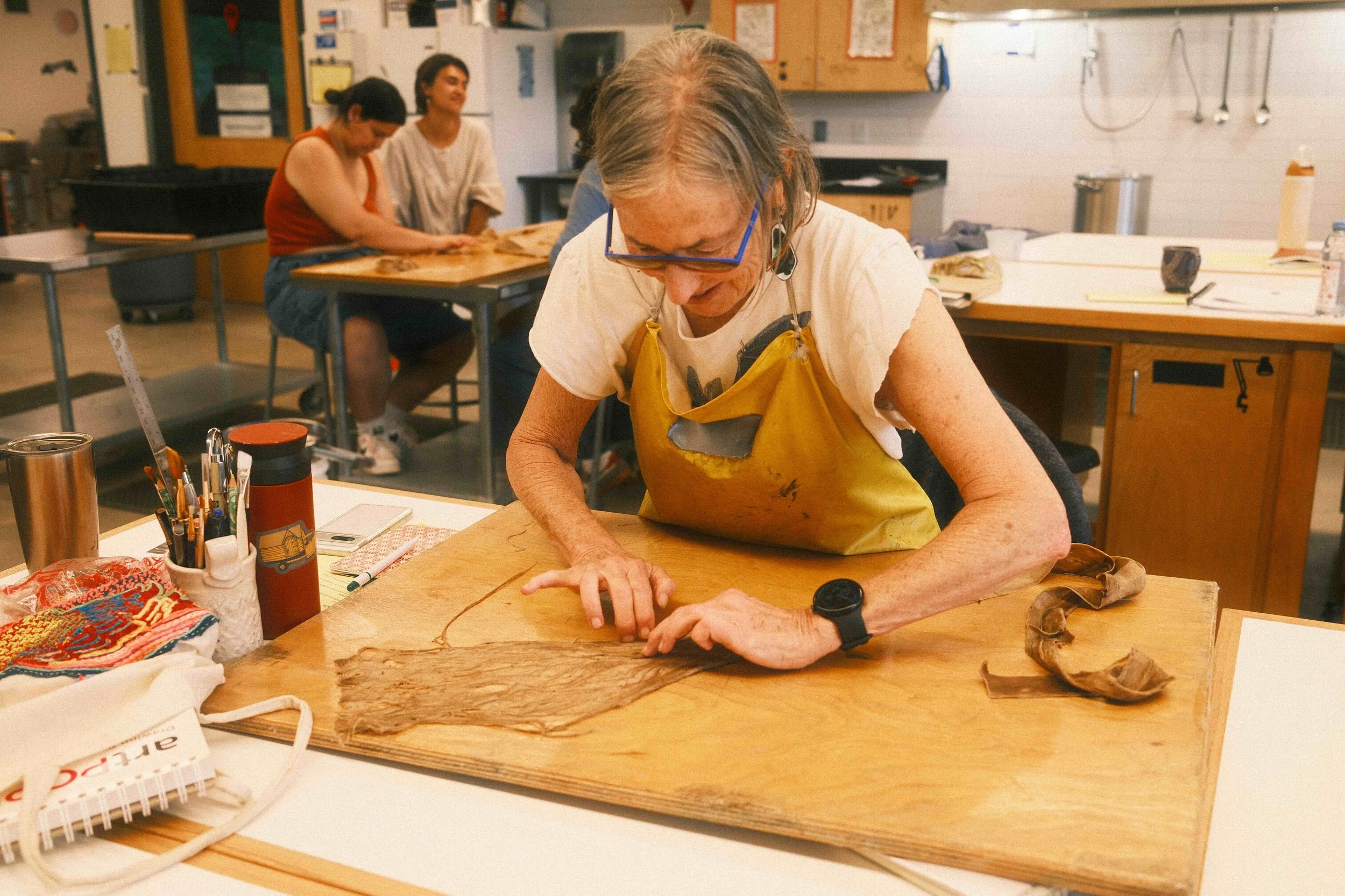 Students worked in various sizes—9’’ x 12’’, 12’’ x 18’’, and 20’’ x 30’’—everyone will have a chance to build their own unique library sample of papers. Instruction covered fiber preparation, hand beating, sheet formation, pressing, drying using traditional equipment, and demos of bark manipulation like bark lace and making thread.