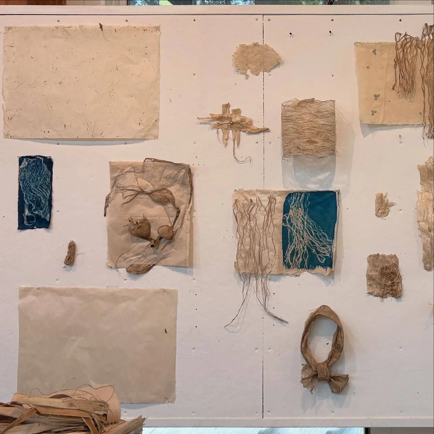 Students worked in various sizes—9’’ x 12’’, 12’’ x 18’’, and 20’’ x 30’’—everyone will have a chance to build their own unique library sample of papers. Instruction covered fiber preparation, hand beating, sheet formation, pressing, drying using traditional equipment, and demos of bark manipulation like bark lace and making thread.